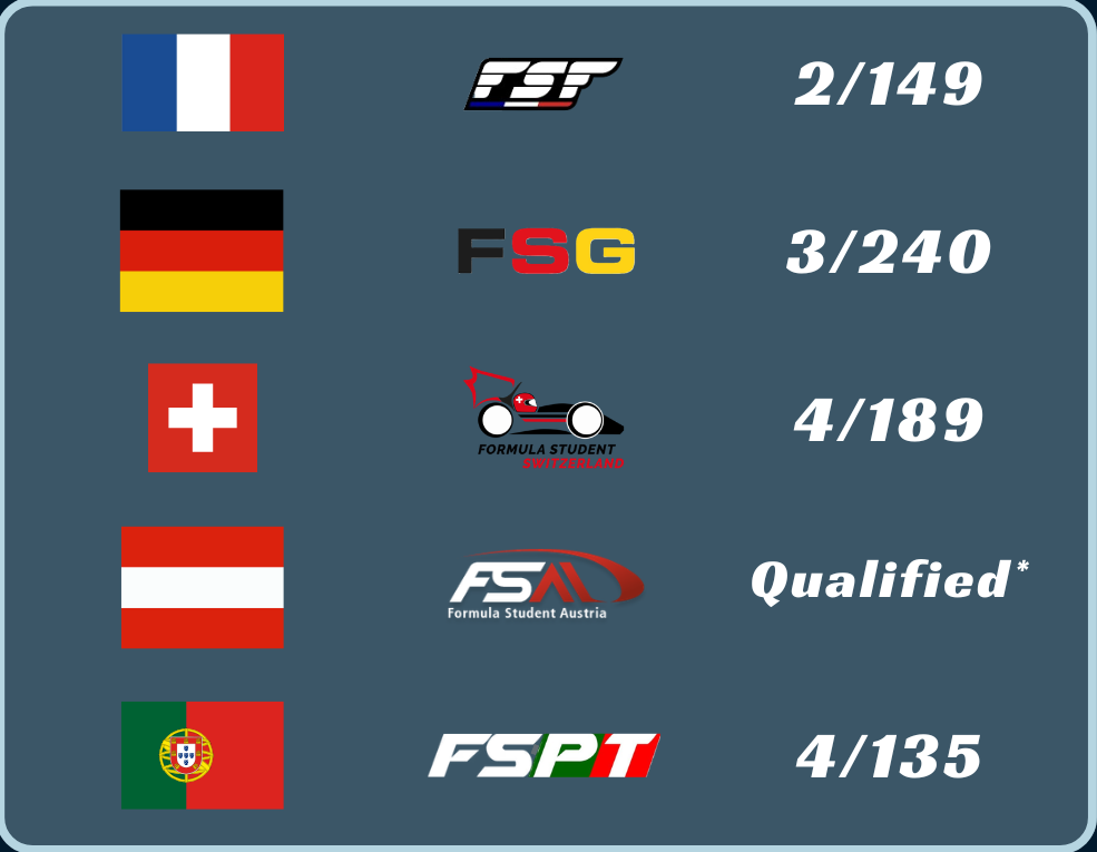 Chaque compétition reçoit un nombre de candidatures supérieur aux places disponibles. La sélection des équipes s’effectue donc via des quiz de qualification. De notre côté, nous avons participé le vendredi 30 janvier à quatre quiz afin de candidater à six compétitions : Formula Student France, Austria, Portugal, Germany, Spain et Switzerland.